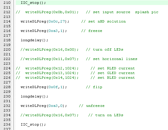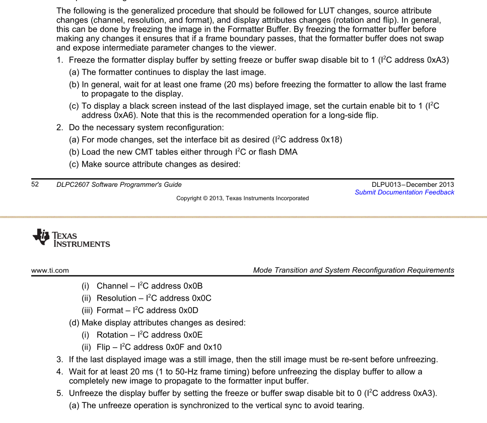 目标系统DLP2000EVM。用外置MCU的IO已经能够实现IIC发送指令,可以修改数据源(可以从启动画面修改到测试画面,调整测试画面种类等等),但无法修改LED电流和画面翻转功能。经查阅数据手册后发现需要按照一定的流程来进行修改,但按照流程进行后所作修改依旧无法生效。现怀疑是不是这种修改要在有视频流存在的前提下才能生效?还是有什么细节要求没注意到?