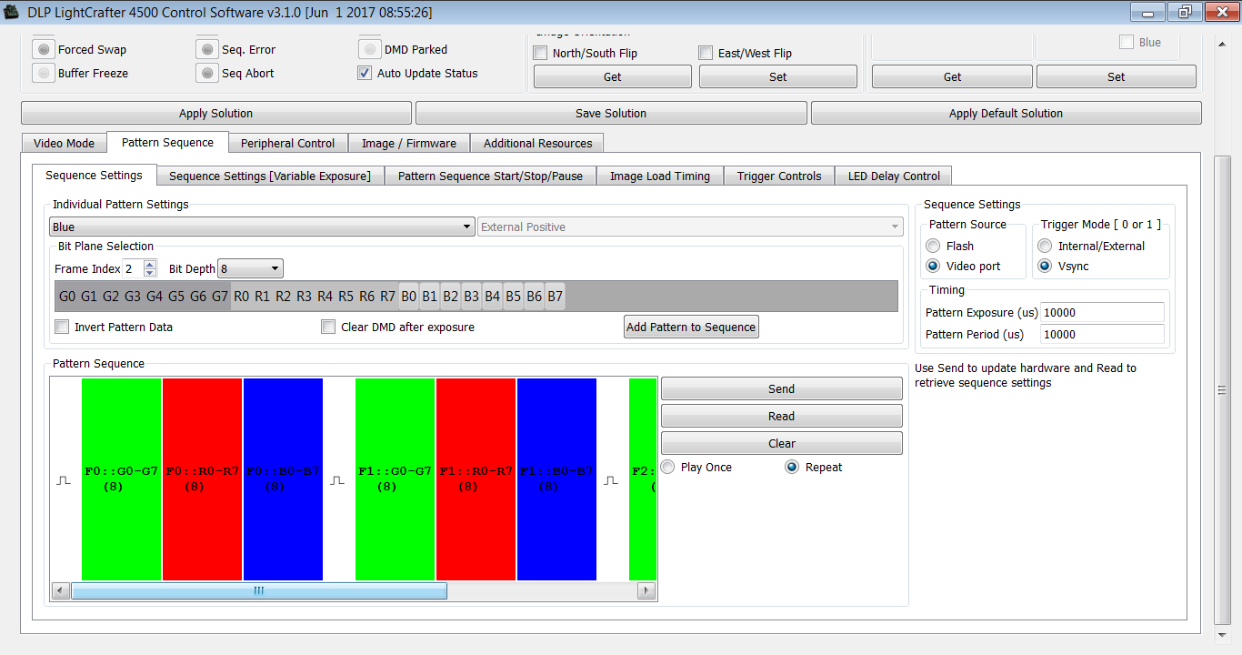 3,我自己试验了问题1,通过在左侧随意设置了一个pattern sequence send 过去并验证通过,通过fpga给J1和J4接口24位paralell RGB图片(36Hz),但是感觉投影仪是在按pattern explosure中设置的时间在投影(投影图片与fpga给J1和J4接口24位paralell RGB图片一致),J14端可以测到trigger_out1信号频率大约为pattern explosure设置时间,那究竟pattern source选择video port如何使用呢?