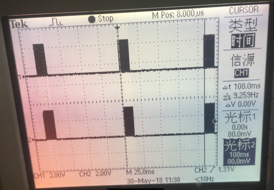 示波器如下 1通道是 TRIG_OUT2 2通道是TRIG_OUT1 TRIG_OUT 周期为104ms 刚好是两倍vsync 屏幕输出会显示两幅图