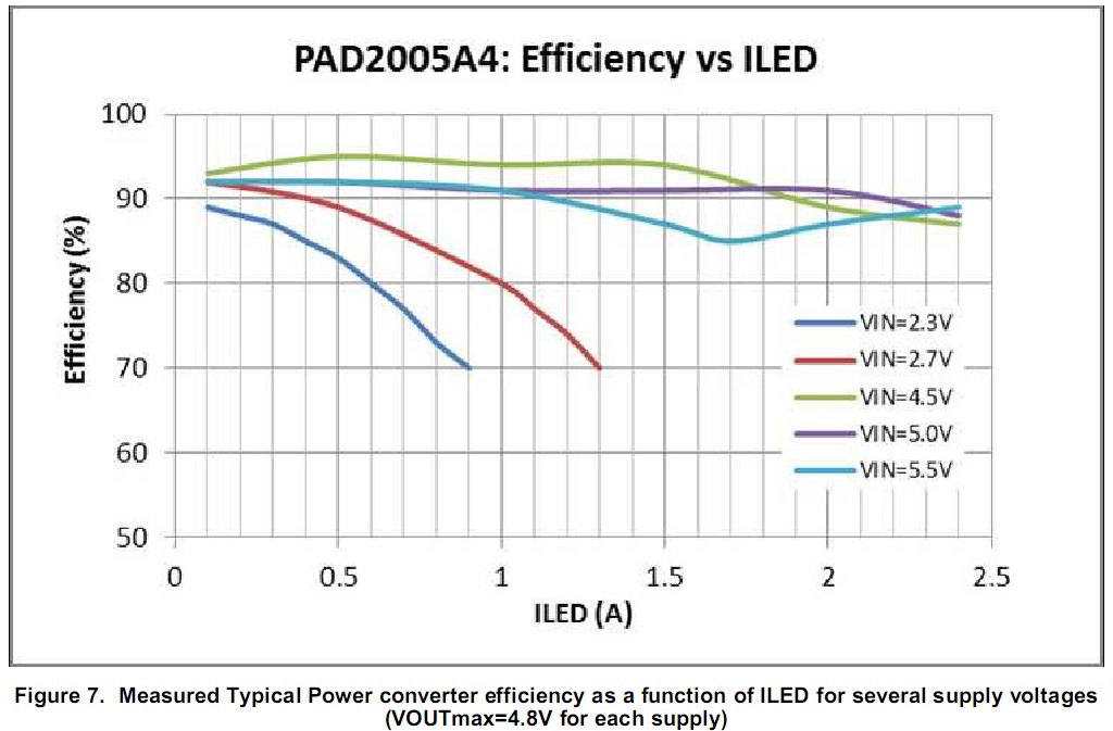 看PAD2005的规格书,在VLED电压2.8V-4.8V的范围内,可以提供最大2.5A的电流。在输入电压满足4.5V-5.5V,效率可以达到87%以上。现在我们的产品,在低功率时(ILED≤2.1A)效率基本可以达到85%左右,但是如果LED电流在加大,效率就会降低到60%-65%左右。请问这是为什么呢?是软件设置问题还是硬件设计存在缺陷?
