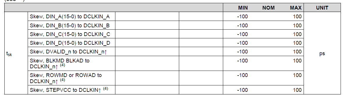 以上四个时序比较好理解,下面的ROWMD、ROWAD、BLKMD和BLKAD相对于DLKIN_n偏移±100ps ,这个DLKIN_n是代表对DCLKIN_A/B/C/D都要满足这个要求吗?如果这样,是不是就意味着,DCLKIN_A/B/C/D 以及其他信号偏差都需要控制在±100ps 之内?