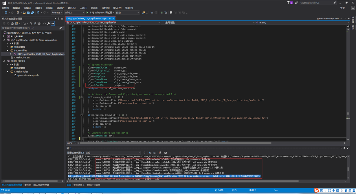 如图,编译无法解析外部命令,请问需要什么库呢,已经定位到dlp::LCr4500        projector;的问题