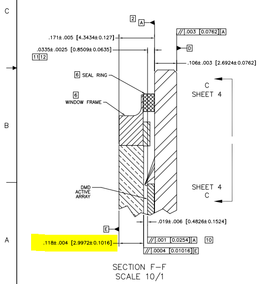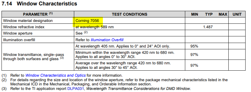 前一阵在TI购买了一个DLP 9000开发模块,由于用途比较特殊,想请问一下关于模块上DMD部分封装的问题。从官网的资料中可以看到,在DMD微镜的前面是有个透明窗片的,那个窗片的厚度大概是多少?是用什么材料制作的呢?还有就是不知道窗片和微镜之间是否还有其他的隔离层,比如一层空气层什么的?谢谢