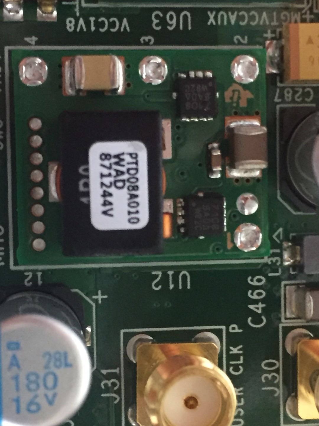 我现在在用VC707FPGA开发板,上面用到了PTD08A010W这款电源芯片,这里提供的是12V转1.8V的功能,但现在我想把1.8V的输出通过软件编程的方法来改成3.3V的输出,请问有谁可以提供具体的帮助吗?下面是实际的电路以及电路原理图,我要调的电压为VADJ_FPGA: