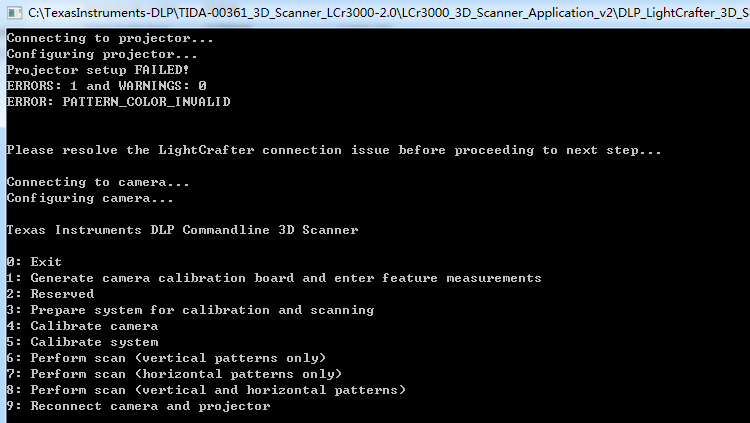修改为GREEN为RED,又变为投影红光和红色棋盘格。但是修改为WHITE,DLP_LightCrafter_3D_Scan_Application.exe程序报错,提示投影仪PATTERN_LED设置不对。