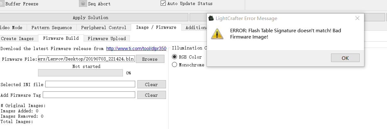 用UltralSO将需要投影的图片生成BIN文件后,然后烧录到DLP4500的GUI中,提示错误是因为什么原因?