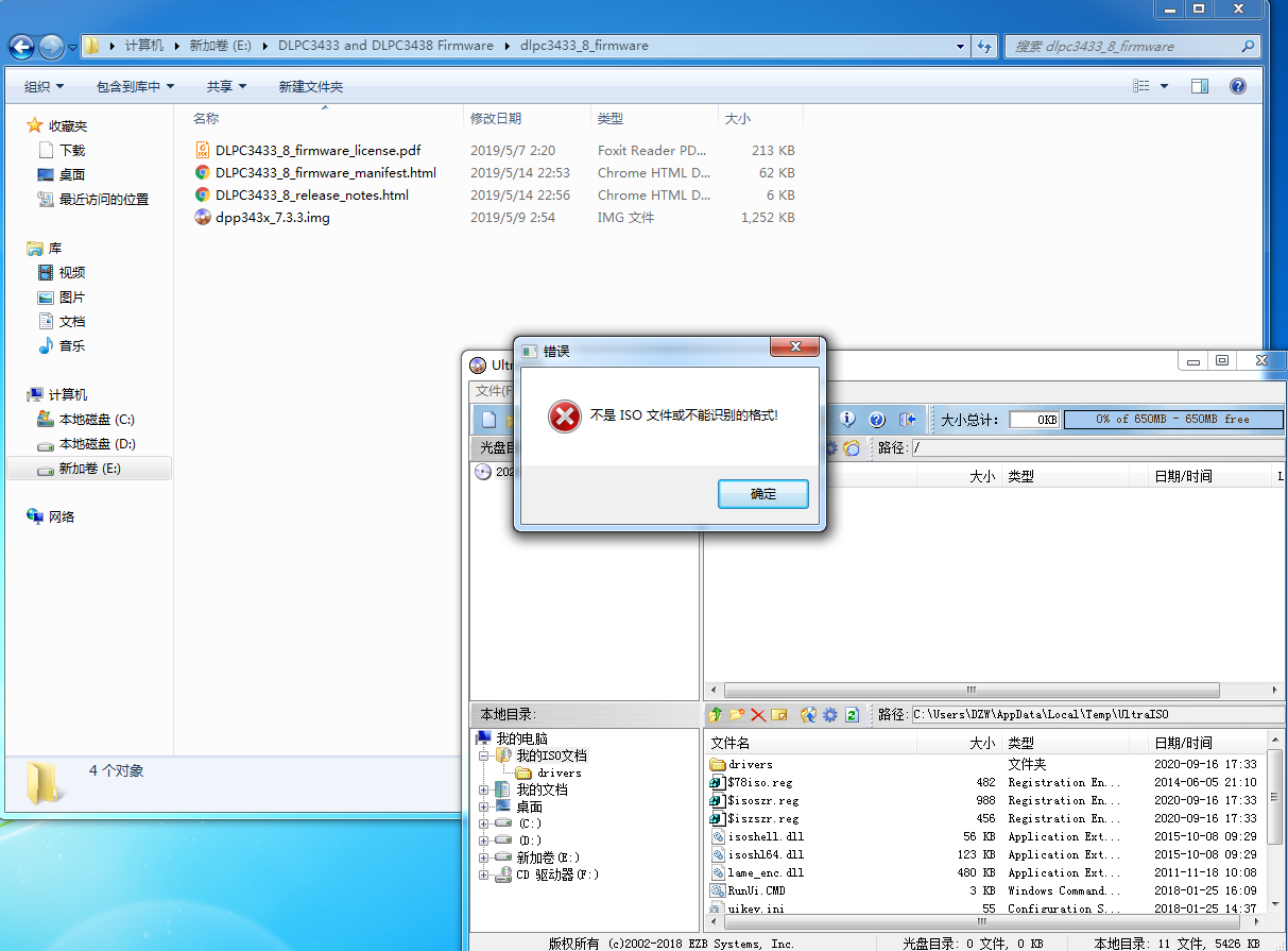 请教TI工程师,我在TI官网上下载了TI提供的固件DLP LightCrafter 3010 EVM-G2 Firmware,在解压镜像文件dpp343x_7.3.3.img出现了无法解压的问题,尝试重新下载了多次,依然无法解压,具体如下图所示: