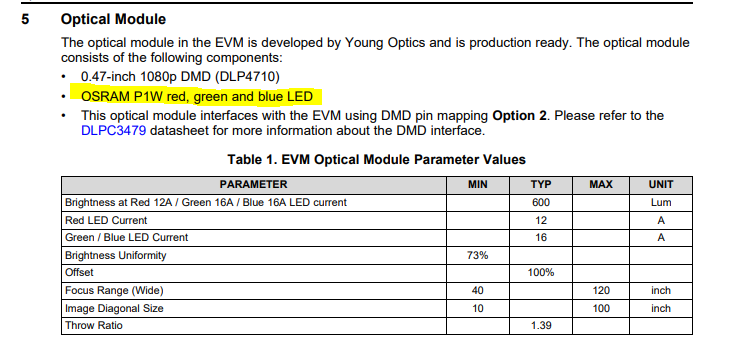 DLP4710 EVM-LC中的RGB三个LED 的参数是多少?用什么产品代替可以满足功率和亮度的要求