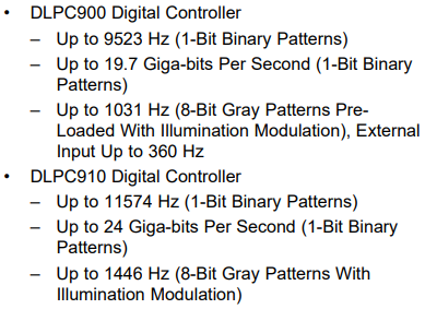 DLP6500FYE的分辨率是1920X1080,时钟是400mhz,加载一行需要32个时钟周期,则加载整幅图的时间为86.4us,采用全局复模式,即便加上微镜的翻转时间与稳定时间,一位图像的总加载时间为99.4us,以一副图像的加载时间作为它的显示时间,那这样计算下来图像的速率都超过了10000hz,但是DLP6500FYE的数据手册给出它的图像速率最高仅为9523hz,请问是我哪里理解错了吗,数据手册上给出的这个9523hz是在何种情况下如何计算出来的。