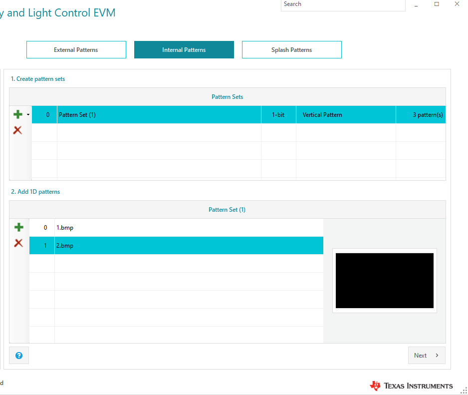 直接通过DLP3010 GUI软件就能看出来导进去的图片是黑的,两张是一摸一样的格式,只不过条纹不同,结果一张正常,一张全黑,请帮忙分析看看