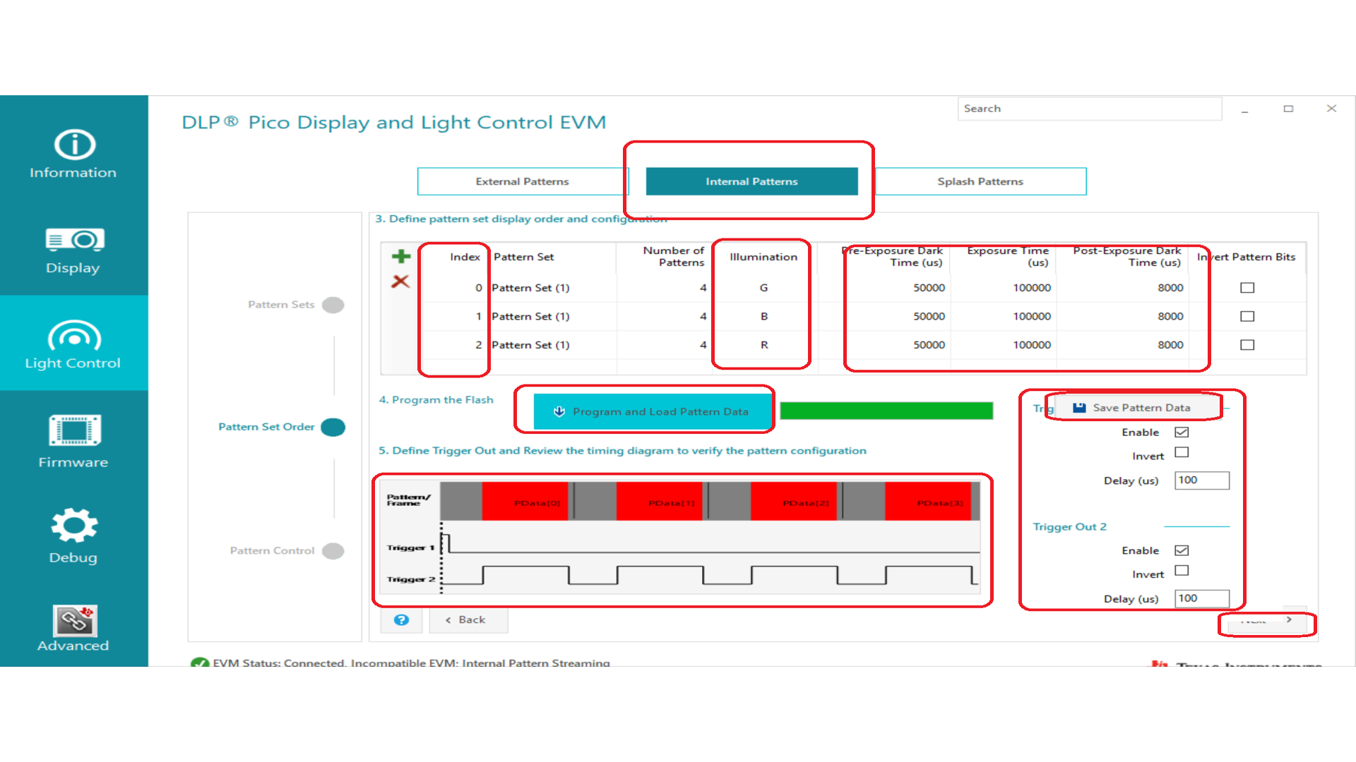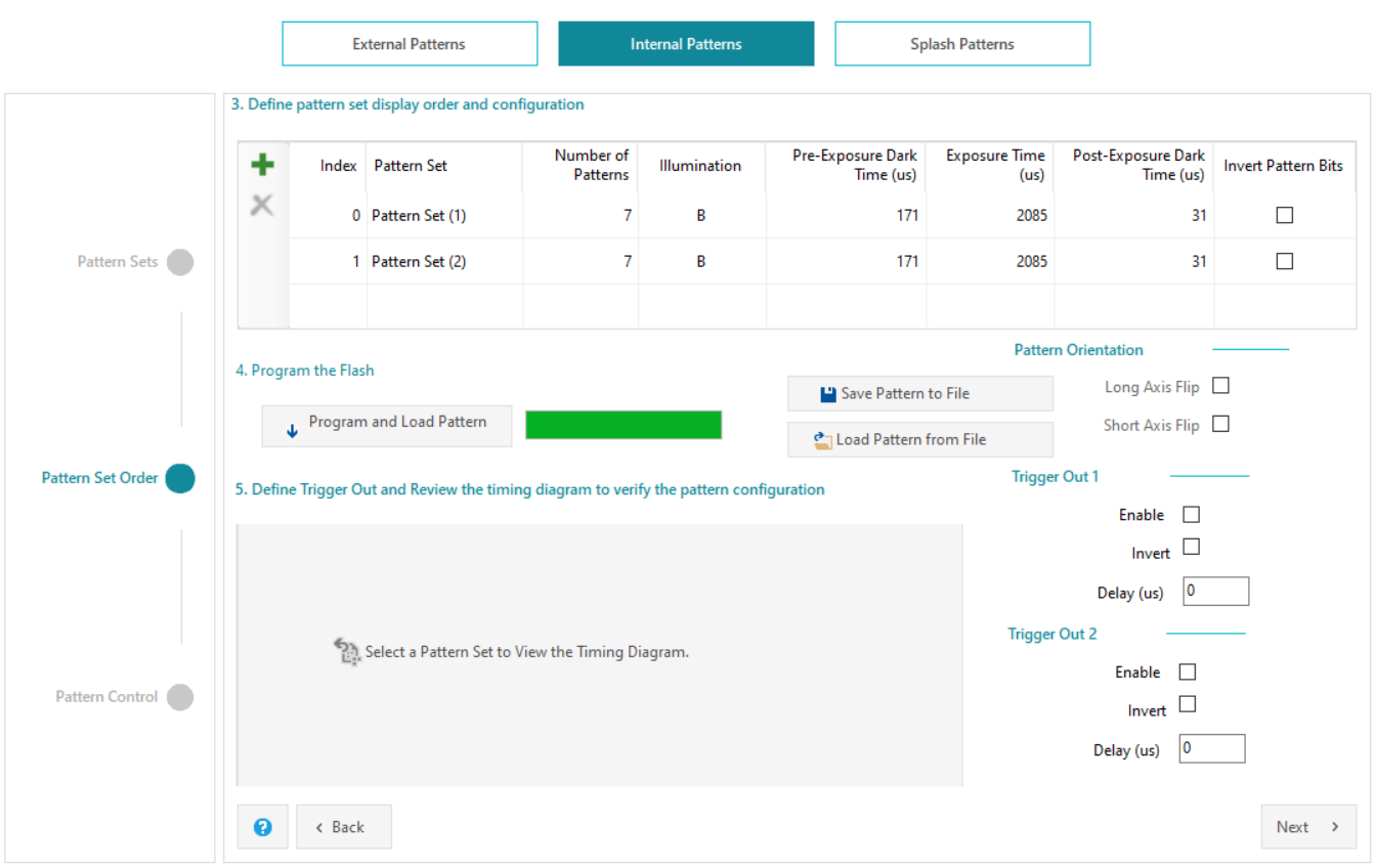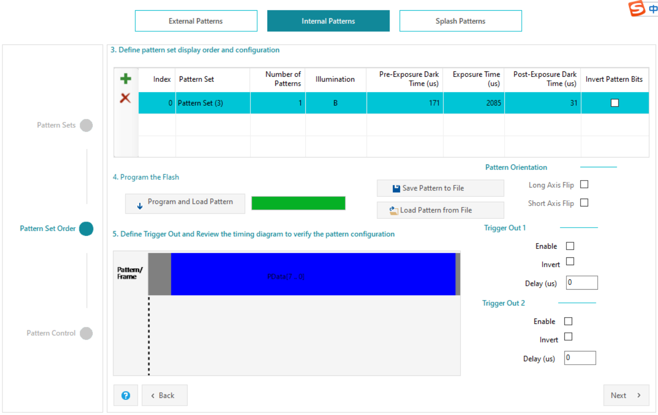 接着按照提示添加两组pattern set ,参数设置按照Release Note中支持的最短时间:171 2085 31 ,然后点击program and load pattern,等待加载完成