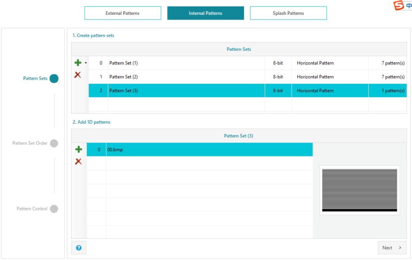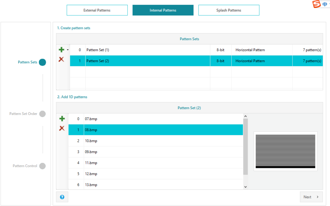 在internal pattern 页面下创建了两组水平8bit pattern sets ,均包含7张pattern,软件中可正常显示: