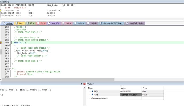 HI,I am a student studying DLP development. I use stm32h750 and dlp2000 for i2c communication, why can’t I read the register data? IIC register (0x36 0x37). the following pictures show the code. and the dubeg mode shows that the test register id[0]=0xFF,whatever id[0] is,the value is always 0xFF.