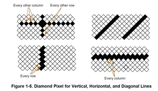 主要的原因是DLP4500 DMD是菱形像素Didmond,我们在电脑中做图片时是以方形像素来计算分辨率的。通过DLP4500投影出来的图像存在一个从菱形像素到方形像素的分辨率转换,大概的原理如下图。具体可以参考DLP4500的规格书以及DLP4500 EVM User Guide.