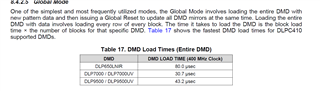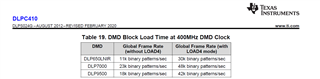 根据手册,DLP9500的刷新频率由 数据传输+ Global Rsts 。如刷新200行,则200*16*1/400 + 4.5 = 12.5us ,则可以设置为80K的刷新率。