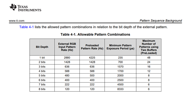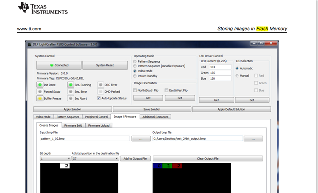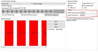 Hi,我使用GUI加载了42张24bit的图片,想使用pattern sequence模式按照1bit的图片顺序播放(即顺序播放42*24张1bit图)。42张24bit图片可以成功加载,并能够成功烧录固件。但在add pattern to sequence的过程中出现问题,具体表现为:我按顺序添加了1008个pattern sequence后,点击send不成功,GUI就停止工作了,如图1。我测试了一下,当pattern数量较少的时候(比如100个),可以成功,但pattern更多以后软件就闪退了。我想请问这个pattern数量有限制吗?如果要播放大量(比如1000个)的pattern,该如何实现?