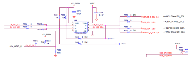 Cypress is used to send I2C commands to DLPC3479 and also to update firmware in SPI flash through USB.