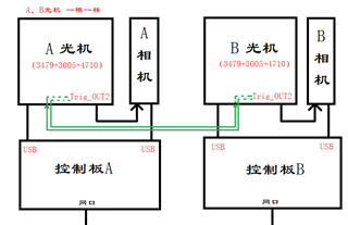 1. A控制板发命令给A光机,控制A光机投光,并产生触发信号,同时触发A相机和B相机拍照,完成后暂停一会;