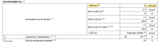 DLP9500UV在小于363nm的波长下,最大的功率密度不能超过2mW/cm2。请参考芯片规格书: