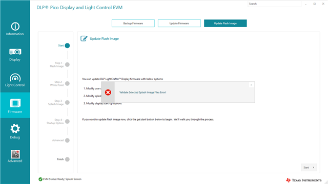 现在连接上DLP4710的EVM之后,想要更改GUI的splash screen,但是最终报警:Validate selected splash image Files error!
