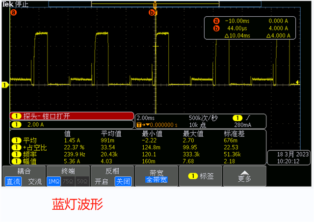 问题:投影仪最初开机正常,播放几分钟视频后,投影出现蓝底,发现是PAD3000内部控制蓝灯的MOS管处于微导通状态;即使用compose关闭蓝灯EN信号,也会有蓝光出现;(下图中蓝灯电流波形在低电平部分有一个尖峰);