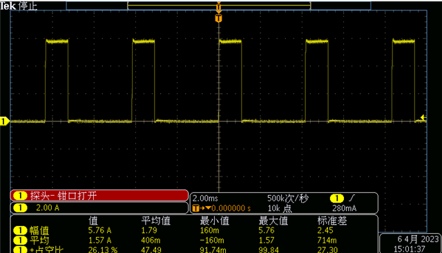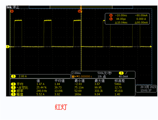 3路通道波形都是正常的,LED灯连接线已经加粗缩短,阴极上的TVS管正常工作,型号正确(其他项目也有使用);蓝灯那路TVS管,因为PAD3000内部微导通,导致测量导通电压数据异常,更换PAD300A后,又恢复正常;附图为正常工作状态下的蓝灯电流波形,没有尖峰;其余两路的波形在问题描述时就有附图,也是正常波形;
