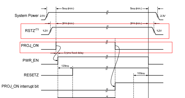 我使用PAD1000和DLPC2607设计HUD显示器,我硬件设计时将PAD1000的INITZ脚和DLPC2601的PARKZ脚连在了一起,我打算用INITZ来控制PARKZ脚, 现在遇到一个问题,我用示波器测量了系统上电初始化时INITZ的波形,从波形中可以看出INITZ在拉高一段时间后又变低了,这导致DLPC2607不能控制PAD1000出光。