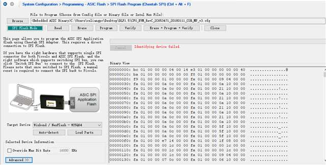 Currently I'm using DLPC120 control program SPI Flash Program to program flash chip。The problem encountered now is that the target device can be identified, but the erasing + programming + verification cannot be achieved, and the error "device verification failed" is reported, Capturing the waveform through the logic analyzer found that the "erase" instruction was sent incorrectly, it should be '0x9f', but the actual capture was '0xb0'。whether it is not supported for this model of chip TI。