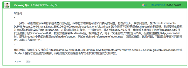 我试着去找到了ti-sdk-am335x-evm-06.00.00.00/linux-devkit/sysroots/armv7ahf-vfp-neon-3.2-oe-linux-gnueabi/usr/include中的libudev.h,所以接下来是要进行怎样操作呢?我试过用SDK中的这个libudev.h文件替换掉系统默认的libudev.h文件,但是好像并没有效果。上述帖子里贵公司的工程师提到的关于交叉编译器的文档又具体是指哪一个呢?