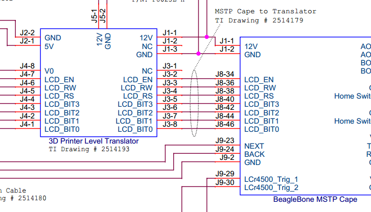 1:官方的TIDA-00293 DLP 3D Printer System Schematic文件中有如图1的一个连接关系,有个3D Printet Level transtar 的J3与BeagleBone MSTP Cape的J8 之间的J3有这接,可是看官方的BeagleBone MSTP Cape所提供的开发资料中,PCB板里的J8一个连接线都没有(如图2所示),是不是官方提供的资料不对呢?