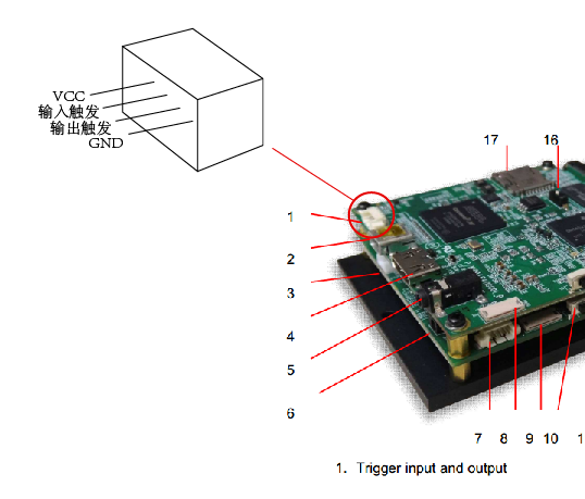 问题:图中1所示的trigger input  and output接口,有4跟引脚,我现在需要使用这个接口,但是不清楚线序是什么,能告诉4根线分别要接什么吗?