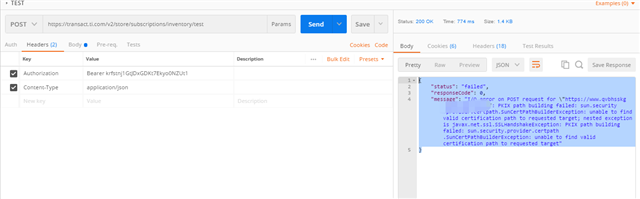 https://transact.ti.com/v2/store/subscriptions/inventory/test but error: PKIX path building failed: sun.security.provider.certpath.SunCertPathBuilderException: unable to find valid certification path to requested target; nested exception is javax.net.ss