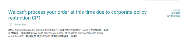 当通过API购买Tl.com上的物料时,系统反馈错误,错误信息为"We can't process your order at this time due to corporate policy restriction CP1”