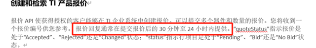 通常在提交报价申请后的 30 分钟至 24 小时内提供报价回复,并且可以使用 GET 方法检索报价回复。“quoteStatus”字段指明报价是处于“accepted”还是“rejected”状态。商品的“status”字段指示某个商品是处于“pending”、“bid”(已报价)还是“no bid”(TI 无法提供价格)状态。
