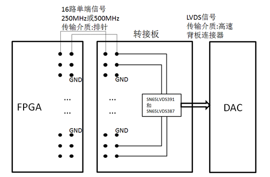 另外,当前的设计是想将一块FPGA板输出的单端信号(16路)转换成LVDS输出,送至DAC,系统示意图如图2。系统期望的速率为250MHz或500MHz,现在FPGA输出的单端信号质量就不是很好(100MHz),信号的过冲严重,转接板的地电平抖动也很厉害(Vpp 500mV左右),FPGA板的地电平抖动Vpp 260mV左右,如果复位则抖动变得很小。FPGA板是已有固定的,扩展IO口只有两个地线。