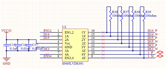 电路原理图如图1所示。请问原理图有问题吗?SN65LVDS391/387的使能端需要电阻进行拉高或拉低吗?如果是,电阻值取多大合适?