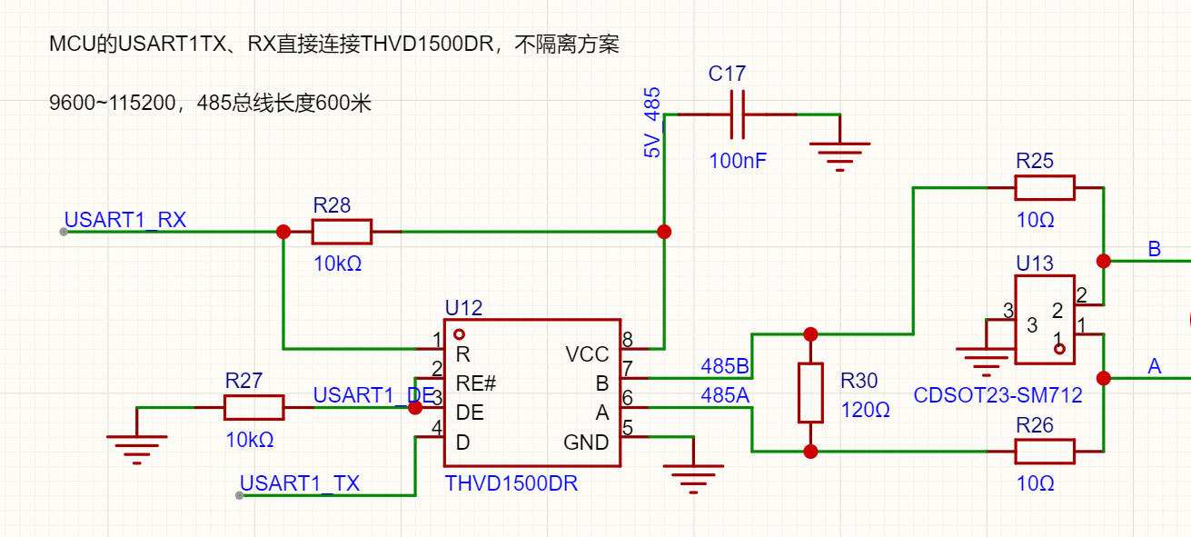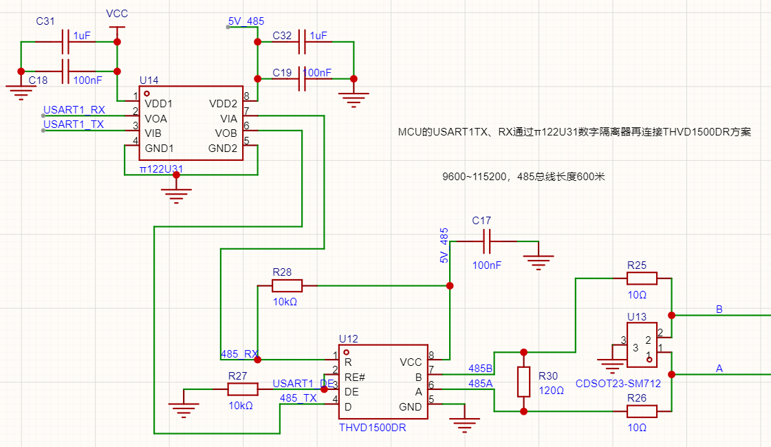 THVD1500: 总线600米,9600~115200,MCU的USART_TX、RX到THVD1500需要使用数字隔离器吗