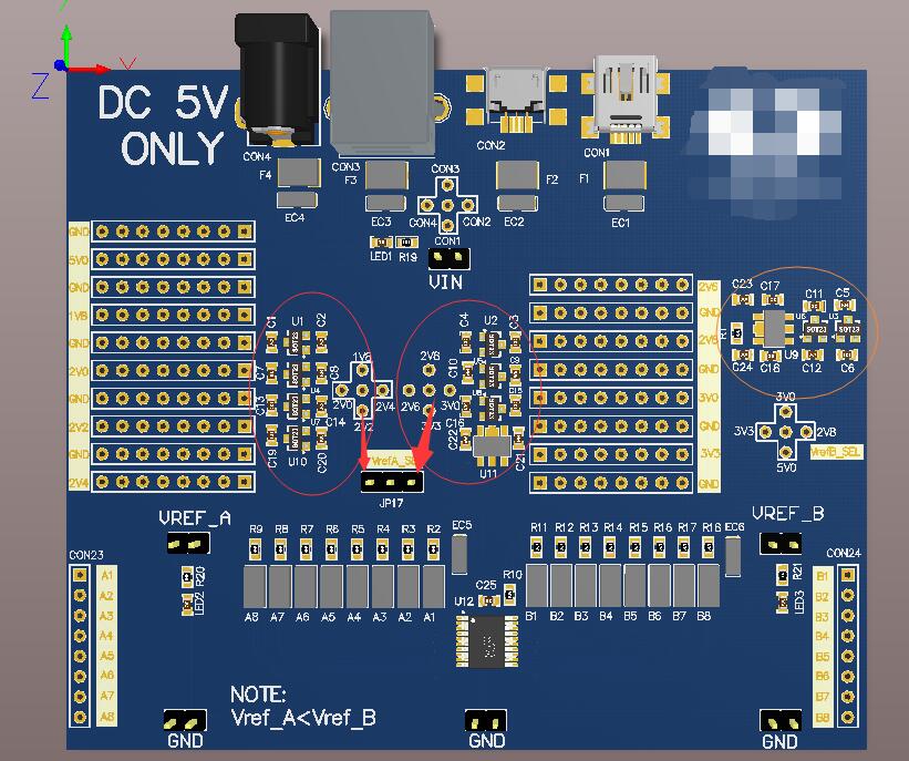 举个例子,我Vref_B接入3.3V,而Vref_A接入1.8V,实际测量发现,Vref_A被拉至2.3V。