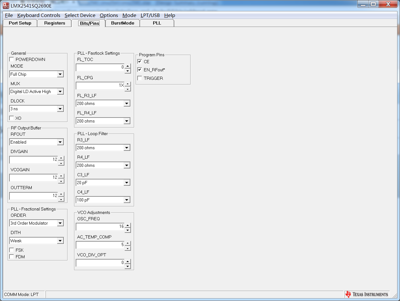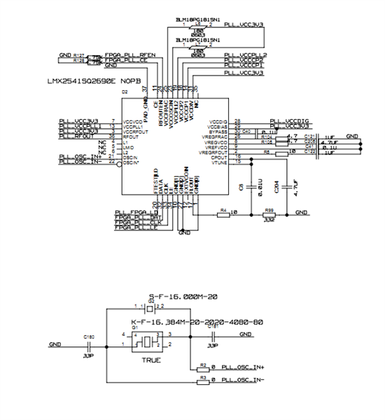 这个是我利用codeloader配置的,导出寄存器值,利用fpga写入,出来的时钟有几Mhz的偏差,调节R3R4C3C4参数会使最终输出频率有一定改变,但是都不是我想要的100Mhz。