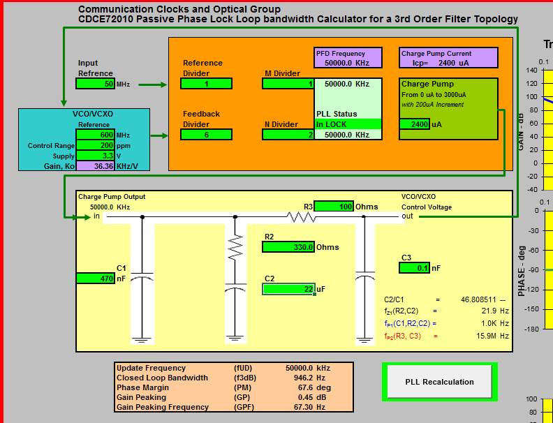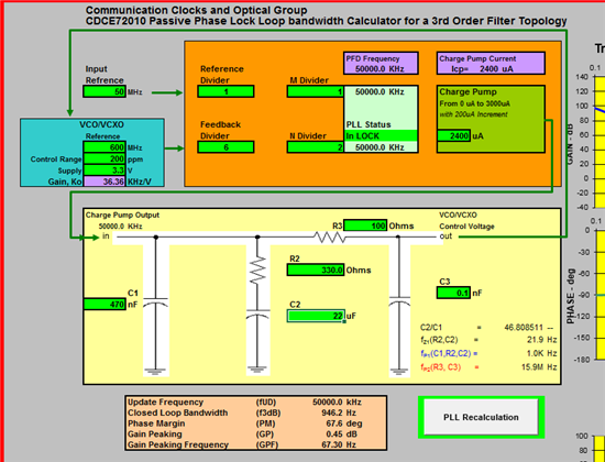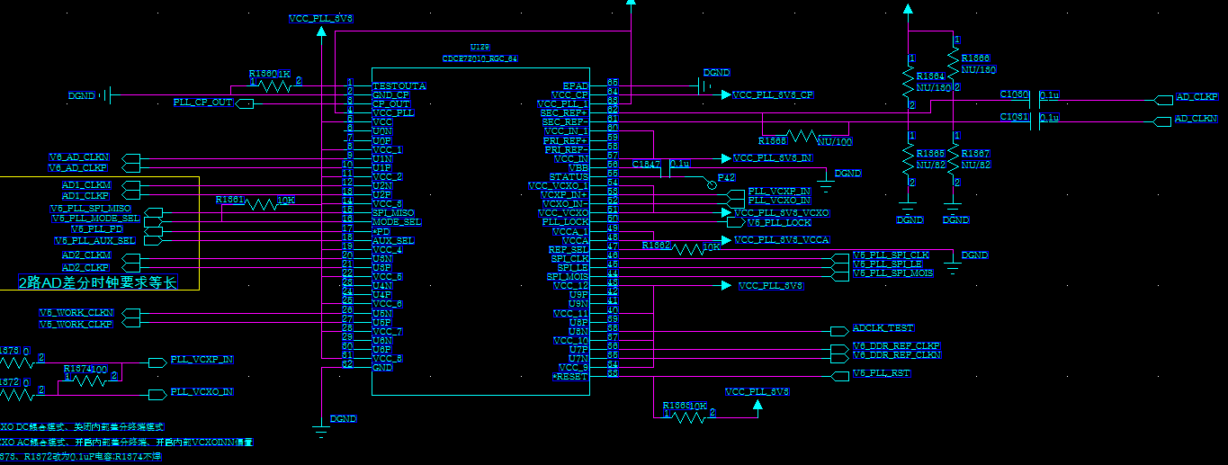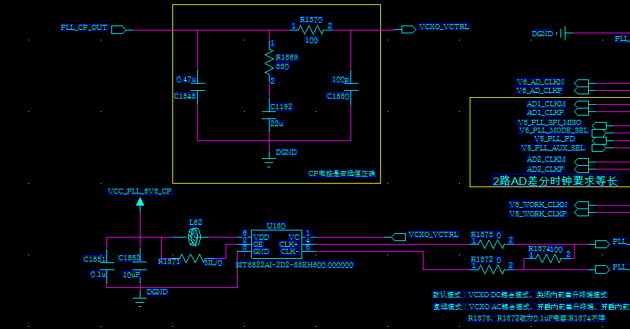 最近在调试CDCE72010,配置完所有寄存器之后,输出端的信号可以探测到相应的频率,但是抖动比较大,而且PLL_LOCK管脚也没有锁定。我的外围LF电路已经按照如图设计: