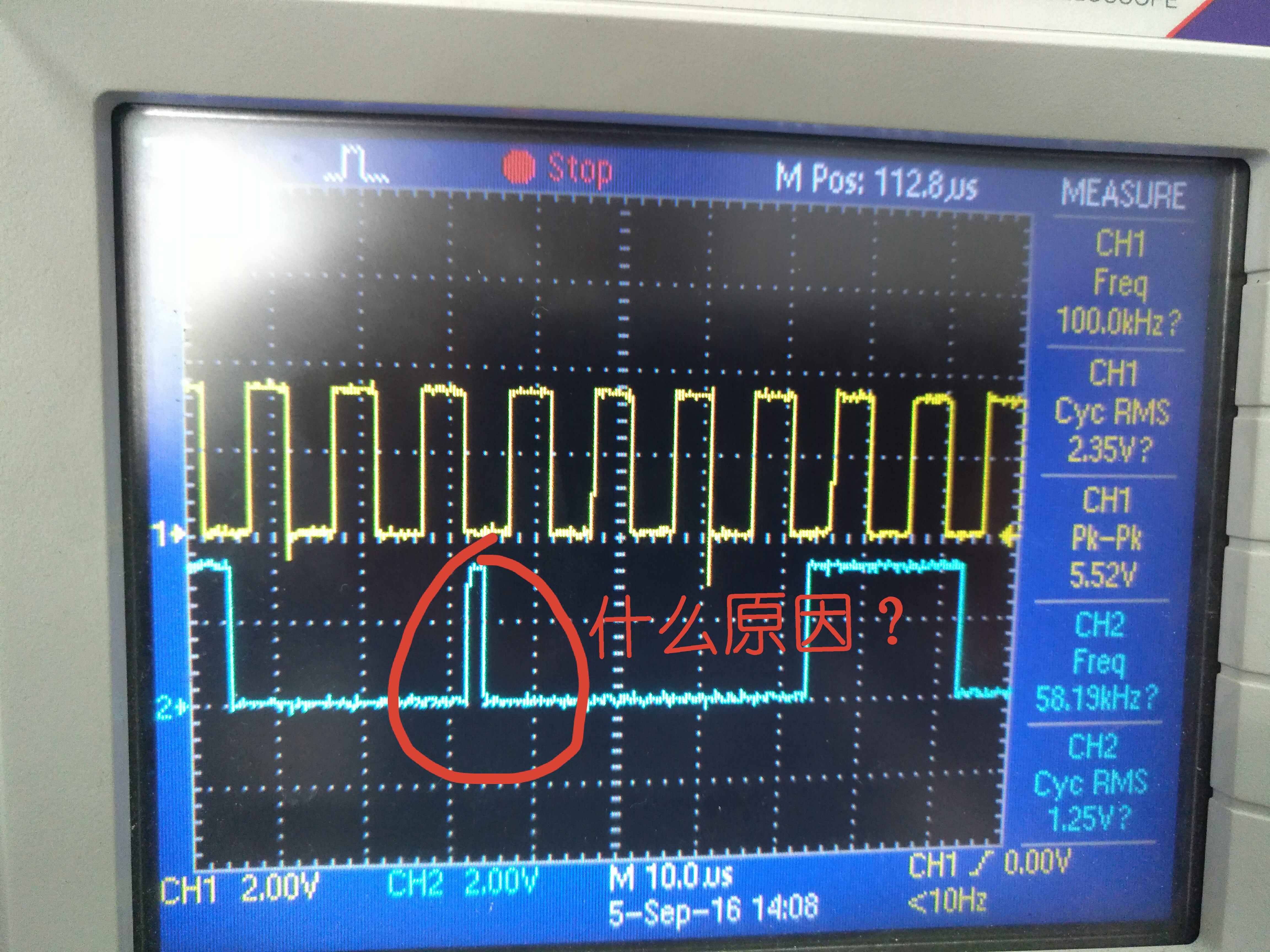 主机向TCA6424A依次写入地址0x44、端口配置寄存器地址0x0C、数据0x00的过程中,在写入最后的数据0x00后TCA6424A的SDA总是不能正确返回应答位ACK(ACK=1),而且在写入地址0x44后正确返回应答位ACK(ACK=0)后,总是莫名的出现一个高电平脉冲。在写入寄存器地址0x0C后同样会出现不正确的应答信号,信号波形见附图,图中黄色线为SCL,蓝色线为SDA。