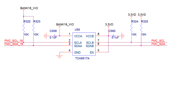 在设计中使用了TCA9517A作为I2C总线的电平转换器,一侧电压为1.8V,连接FPGA;另外一侧电压为3.3V,连接4个I2C从设备(从设备是ADT7411、M24C02和两个低速DAC),电路图如下所示。