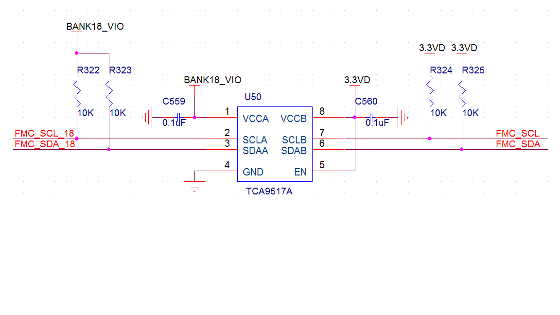 在设计中使用了TCA9517A作为I2C总线的电平转换器,一侧电压为1.8V,连接FPGA;另外一侧电压为3.3V,连接4个I2C从设备(从设备是ADT7411、M24C02和两个低速DAC),电路图如下所示。