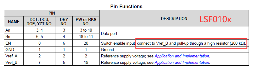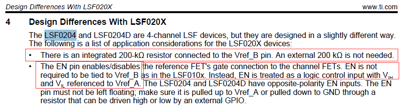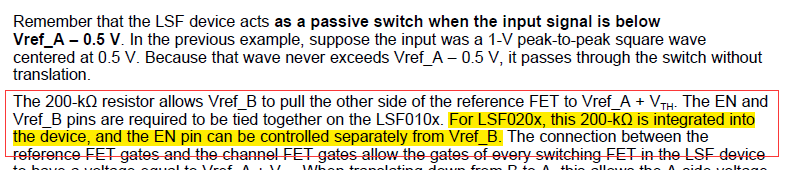 2,LSF0204x系列,EN引脚是以Vref_A(低压侧)为参考的;内部集成200k电阻,且是以Vref_A为参考的。