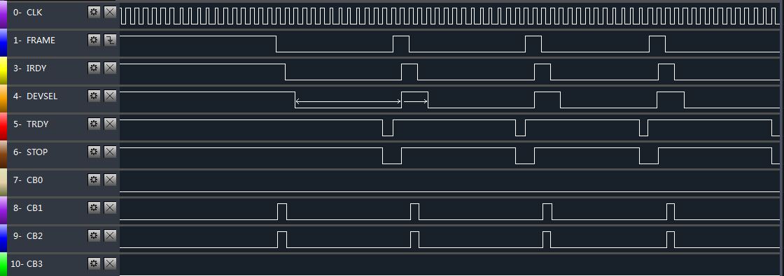 因为是突发传输,FRAME信号在设备发起STOP信号前一直有效,这期间我发现仅有32比特的有效数据等到传输。