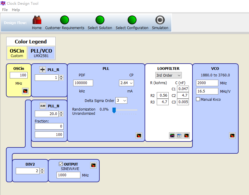 最近在使用LMX2581,100MHZ输入,1G输出。设置以及外围电路取值都是按照clock design tool 上选取的。寄存器配置使用的是别人用过的,同样的100M输入,1G输出。