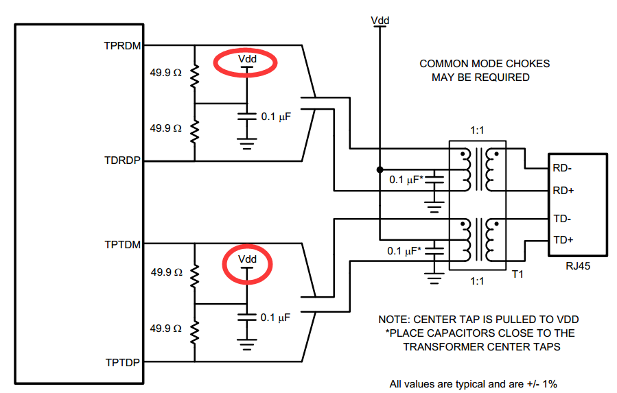 正常来说当PHY的UTP端口是电压型驱动的话,我变压器的中心抽头是肯定需要接到VDD的,TX-/TX+、RX-/RX+ 并接49.9欧的电阻通过一个0.1uF的电容到地因为完全能够理解,可是49.9欧电阻为什么一定要上拉到VDD呢?