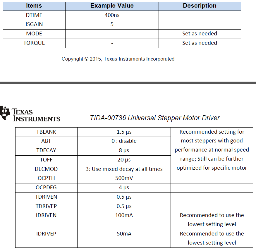 我照着官网上的原理图,以及参数配置的DRV8711,电机倒是能正常运转,就是DRV8711本身发热很厉害,我调到0.3A,空载,也是发热厉害,手都不敢摸,一会儿就过热保护了,用示波器打输出,发现芯片工作不正常,一直连续工作。我买的现成的驱动器同样是用的DRV8711,但是人家的就工作的很好,A相和B相识间歇工作的,即有90°的相位差,这样芯片的发热就很正常,跑好长的时间,也就温热,而且电流为0.7A。我不知道是我参数没有设置好,还是我买的这一批次的DRV8711有问题