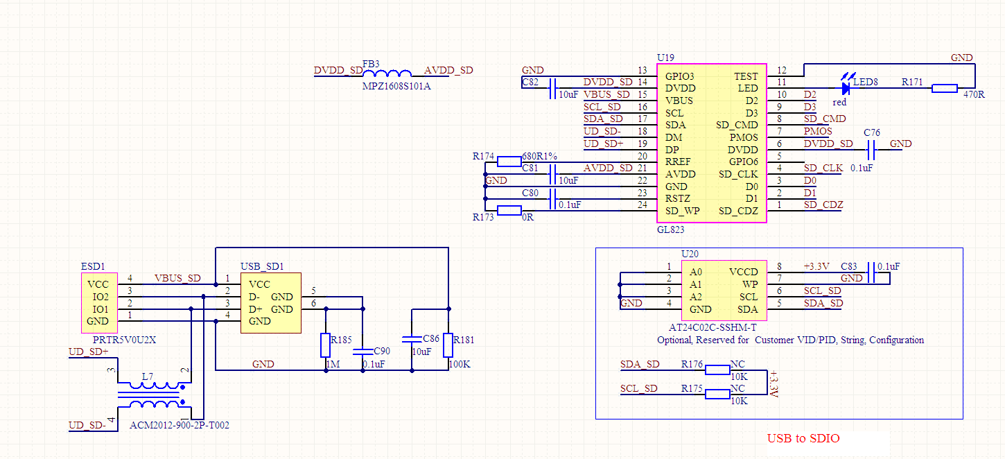 GL823是读卡器芯片,有data0~data3、cmd、clk,cd管脚,除clk脚外其他脚均有20K或50Kd的内部上拉,通过TS3A44159RGTR接MicroSD卡,GL823接TS3A44159RGTR的NO端,MicroSD卡接TS3A44159RGTR的COM端。