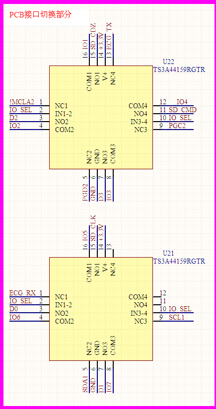 IO_SEL为高电平时,TS3A44159的NC to COM是关闭的,NO和COM接通,那对于上面TS3A44159来说,也就是说现在发现D2和IO2,SD_CDZ和IO1有问题?但看电路上,IO1和IO2接的USB的差分对?
